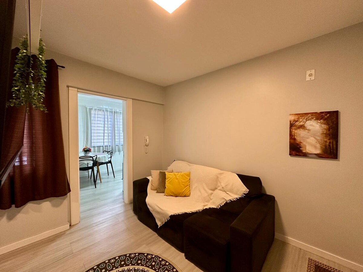 Apartament duplex cu 2 camere cu baie proprie în centrul orașului Chapecó, renovat la sfârșitul anului 2025. Standard excelent, confortabil și modern, 1 garaj, bucătărie completă, aer condiționat cald/rece în cele 2 dormitoare, dușuri cu încălzire centrală, Smart TV, Wi-Fi și Netflix. Situat pe bulevardul principal, în inima orașului. Aproape de restaurante, baruri și piețe excelente. Acesta se află la 2000 de metri de Condá Arena/Event Center, la 800 de metri de Boardwalk, la 800 de metri de EcoParque, la 2800 de metri de mall. Când rezervi, completează numărul exact de oaspeți.
