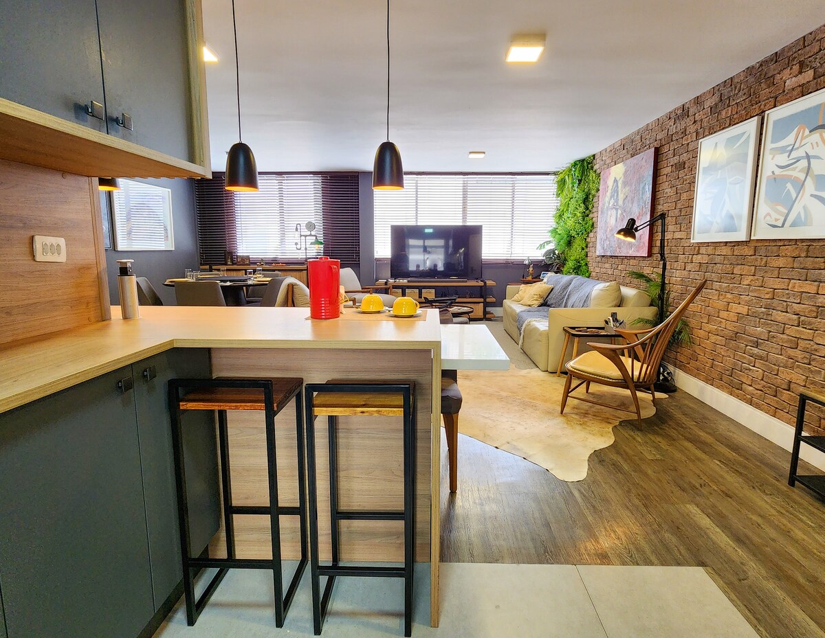 Uma verdadeira obra de arte no melhor bairro de Curitiba! Este apartamento é a casa de um arquiteto de muito bom gosto que tirou um ano sabático para viajar o mundo com sua Kombi, do Ushuaia ao Alaska. Enquanto isso presenteou os visitantes de Curitiba com esta obra prima! > Estadias acima de 90 noites > Suíte cama Queen > Escritório "nerd zone" reversível p/ suíte, cama casal retrátil > Sofá cama na sala > Comporta 6 pessoas > A/C todos ambientes > 1 vaga garagem