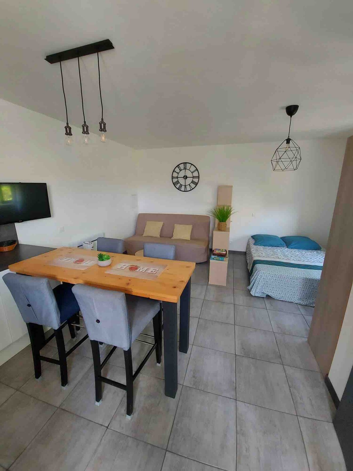 Relaxează-te în această cazare amplasată în inima orașului La Clape. Situat în Armissan (11110), acest studio complet mobilat este ideal pentru a te bucura de calmul unui mic sat tipic. Aproape de mare: plaja Narbonne (10 minute), Gruissan (15 minute) și Saint Pierre la Mer (15 minute cu mașina) Aproape de oraș: Narbonne și Grands Buffets (10 minute cu mașina). 🏡 Spațiul: Confortabil și funcțional cu: - bucătărie complet utilată - pat 160 cm - Duș - aer condiționat reversibil - Wi-Fi - TV