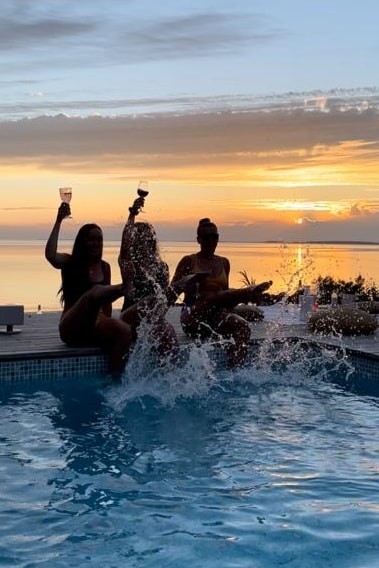 Fin sjöutsikt med pool, jacuzzi och bastu.