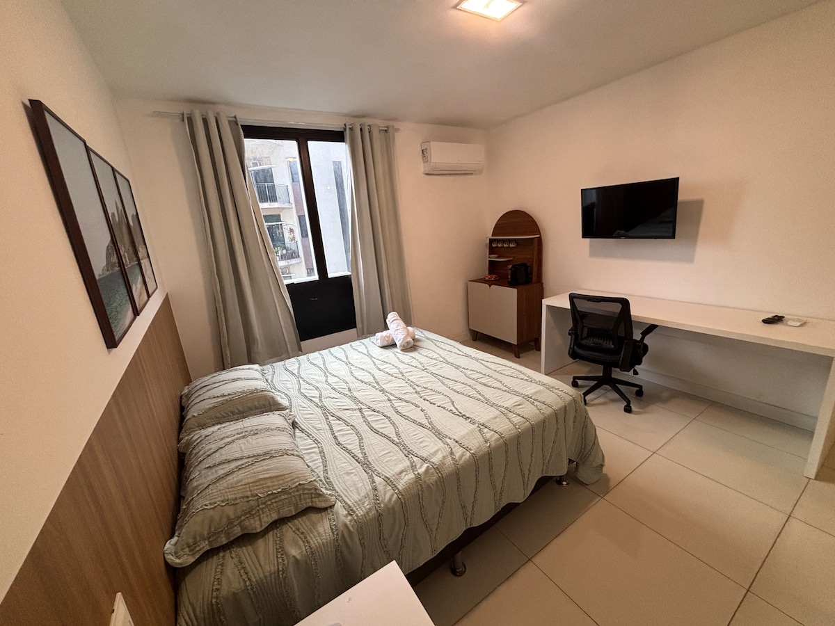 Apartament frumos între Ipanema și Copacabana, oferă: • 1 dormitor cu pat matrimonial • Aer condiționat în dormitor și în living • 500megawifi Televizor inteligent cu Netflix, Globoplay și Amazon Prime • Bancă cu scaun pentru studiu/muncă • Bucătărie cu plită, cuptor cu microunde • Filtru de apă • Ustensile de bucătărie de bază • Pahare de vin și vin spumant • Masă cu 4 scaune • Baie (uscător de păr, prosoape și articole de toaletă) • Călcarea hainelor • Living cu canapea extensibilă