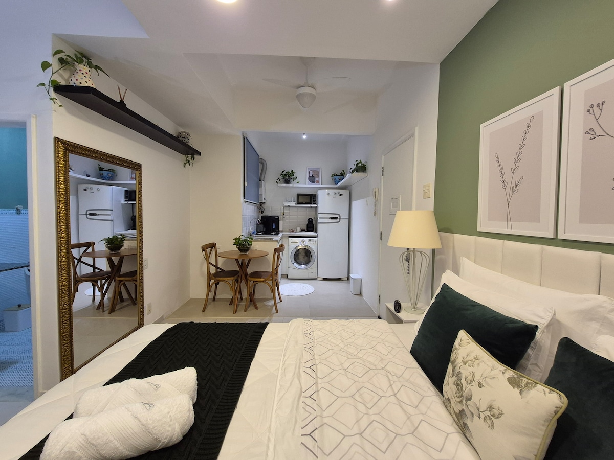 Aconchegante Studio a meia quadra da praia de Ipanema. Prédio com portaria 24hs , rampa de acesso para deficientes , área comum com muito verde , bicicletário. Apto todo equipado para seu conforto .Toalhas de banho e praia , Roupa de Cama 270 fios , Duvet de Linho, Ar condicionado nos 2 ambientes (quarto e sala) , Frigobar , microondas , fogão de indução , cafeteira Nespresso e convencional ,TV 50" , Wi-Fi , tv a cabo , ferro de passar roupar , secador cabelo, rede de balanço.