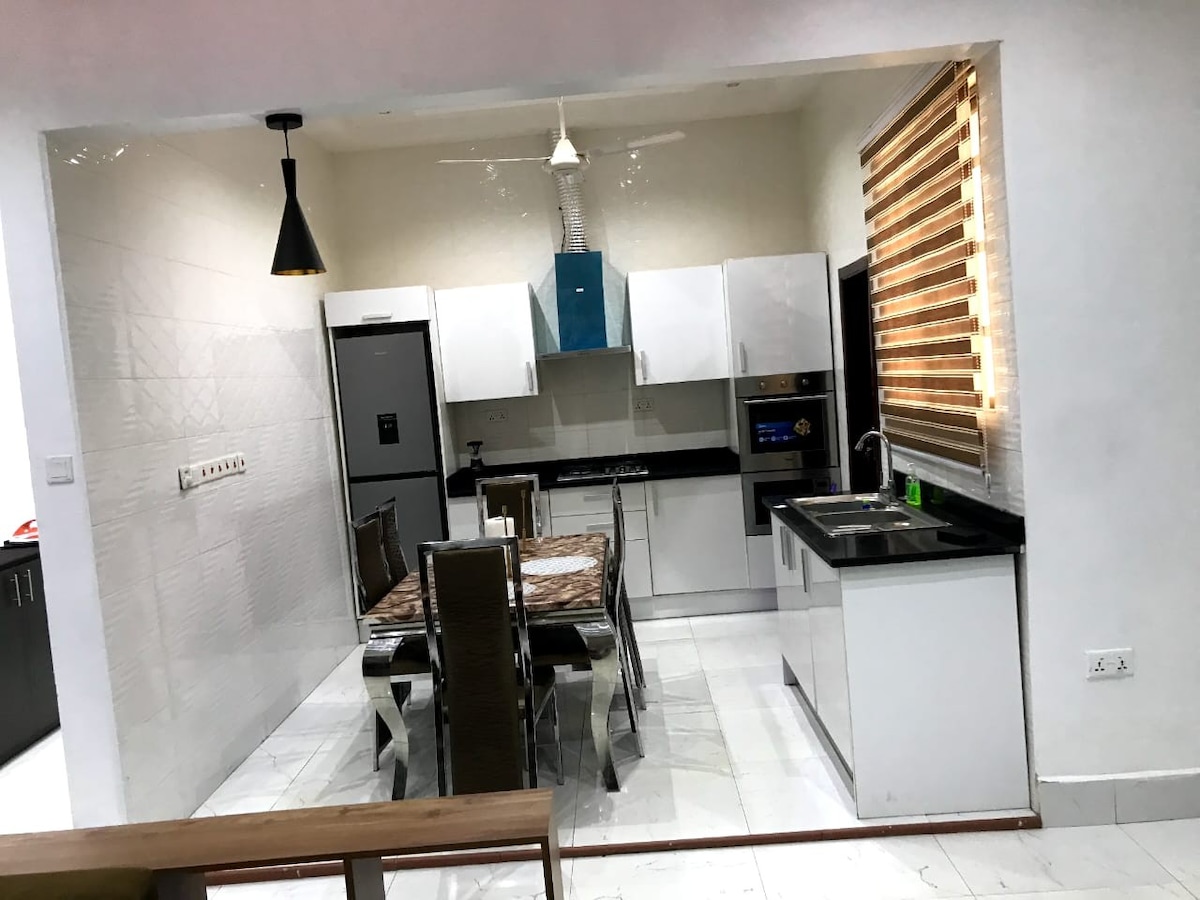 Distrează-te cu întreaga familie în acest apartament liniștit și elegant. Această suită simplă, curată, cu 3 dormitoare din Kumasi, are 3 băi de lux, arhitectură modernă kumasi și locație excelentă la doar 10 minute de Aeroportul Kumasi. Bucură-te de confortul parcării private, WiFi gratuit, un Smart TV de 55"și 3 televizoare inteligente în toate camerele, bucătărie deschisă și sufragerie. Cu o centrală electrică de rezervă, o echipă profesionistă și securitate strictă non-stop, confortul tău este prioritatea noastră.