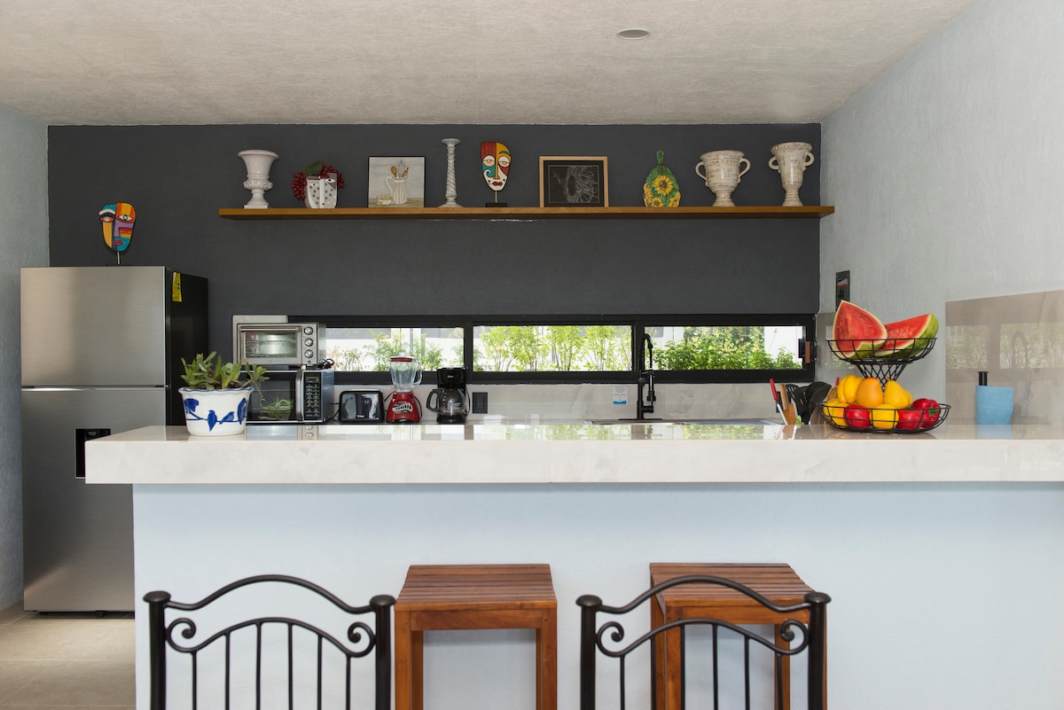 Relaxează-te în această frumoasă locuință în stil industrial, situată în clubul de golf Xochitepec. Are propria piscină și grădină, astfel încât să te poți bucura de ea în privat cu prietenii și/sau familia și animalele de companie. Perfect pentru biroul de acasă!