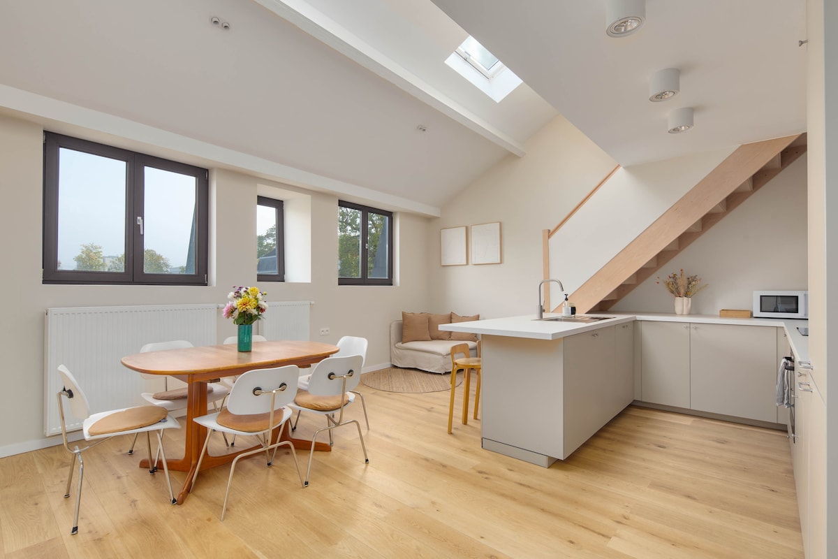 Apartament liniștit și luminos de 130 m2 renovat recent (2021), cu tavane înalte, la etajul 1. Bucătărie complet echipată, deschizându-se într-o sufragerie mare în continuitate, cu un living, un hol de intrare și un birou. Partea din spate a apartamentului duplex are 2 dormitoare frumoase, unul cu pat BEKA, o baie cu duș și cadă, o toaletă separată și o spălătorie mică echipată. Mobilier de epocă, atmosferă caldă și confortabilă