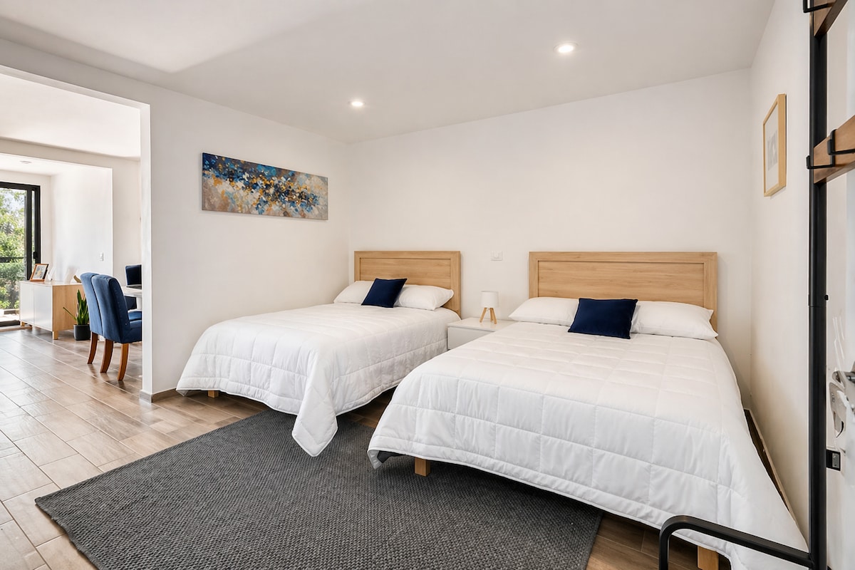 Bright, modern high-rise space on the 18th floor with open city views. Ideal for couples, friends, and relaxed longer stays 3 Queen beds for up to 6 guests Equipped kitchen Large-capacity washer and dryer machine Electric blinds and high-speed Wi-Fi for home office Enjoy a 24/7 GYM, rooftop, and in-building parking for 2 cars Pet-friendly building with security service and 24/7 security cameras Quick access to Cholula (5 min away), Angelópolis (8 min away), and key attractions