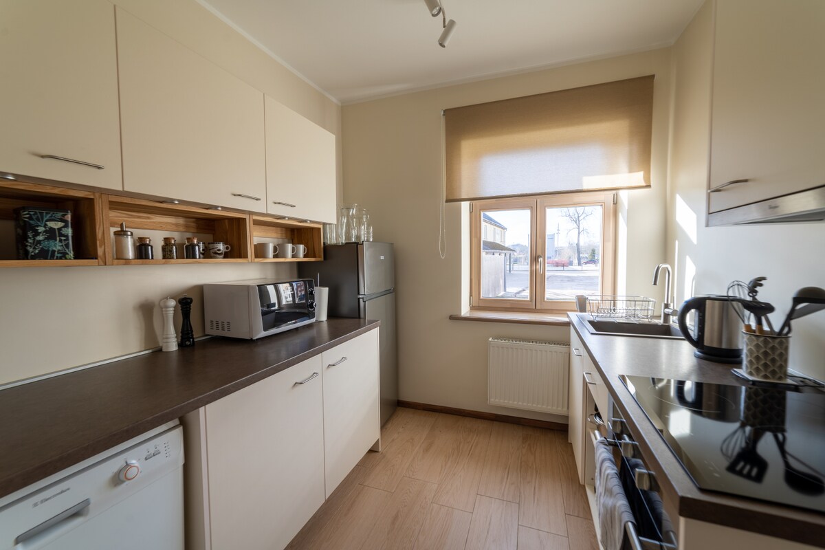 Apartament luminos, spațios, cu două camere, chiar în centrul orașului Dobele. Două camere, bucătărie complet utilată, duș privat și facilități. Apartamentul are parcare gratuită. Pentru confortul tău, un pătuț de călătorie pentru copii, un scaun înalt sunt, de asemenea, disponibile.