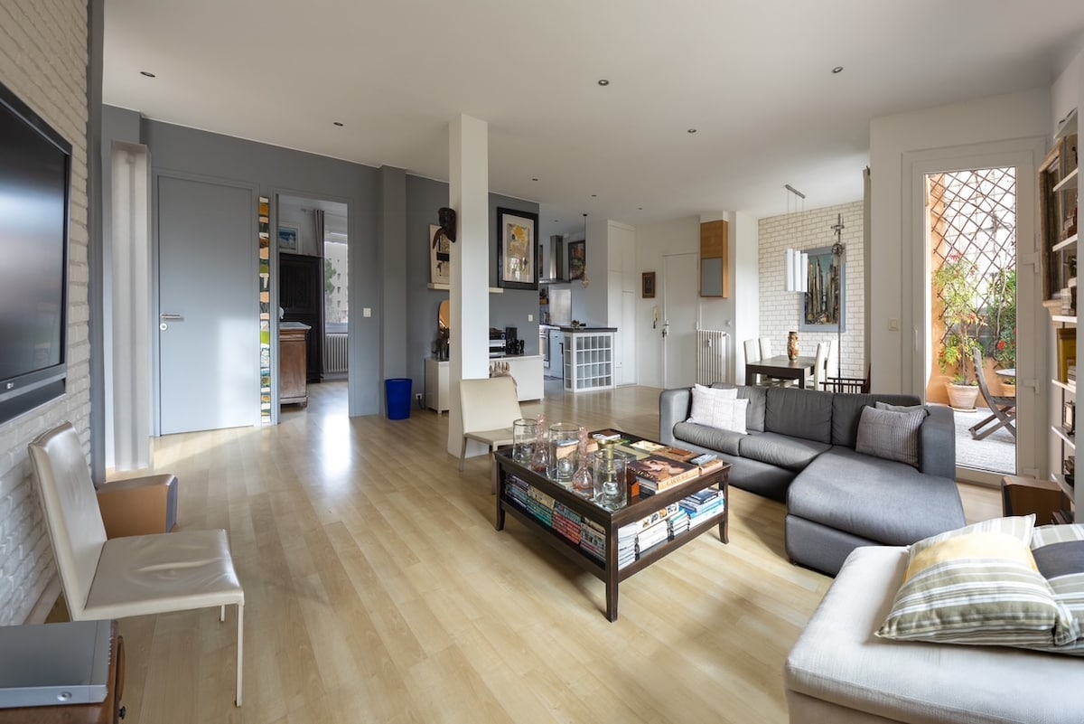 Loft frumos cu aer condiționat în fața unui parc. Garaj