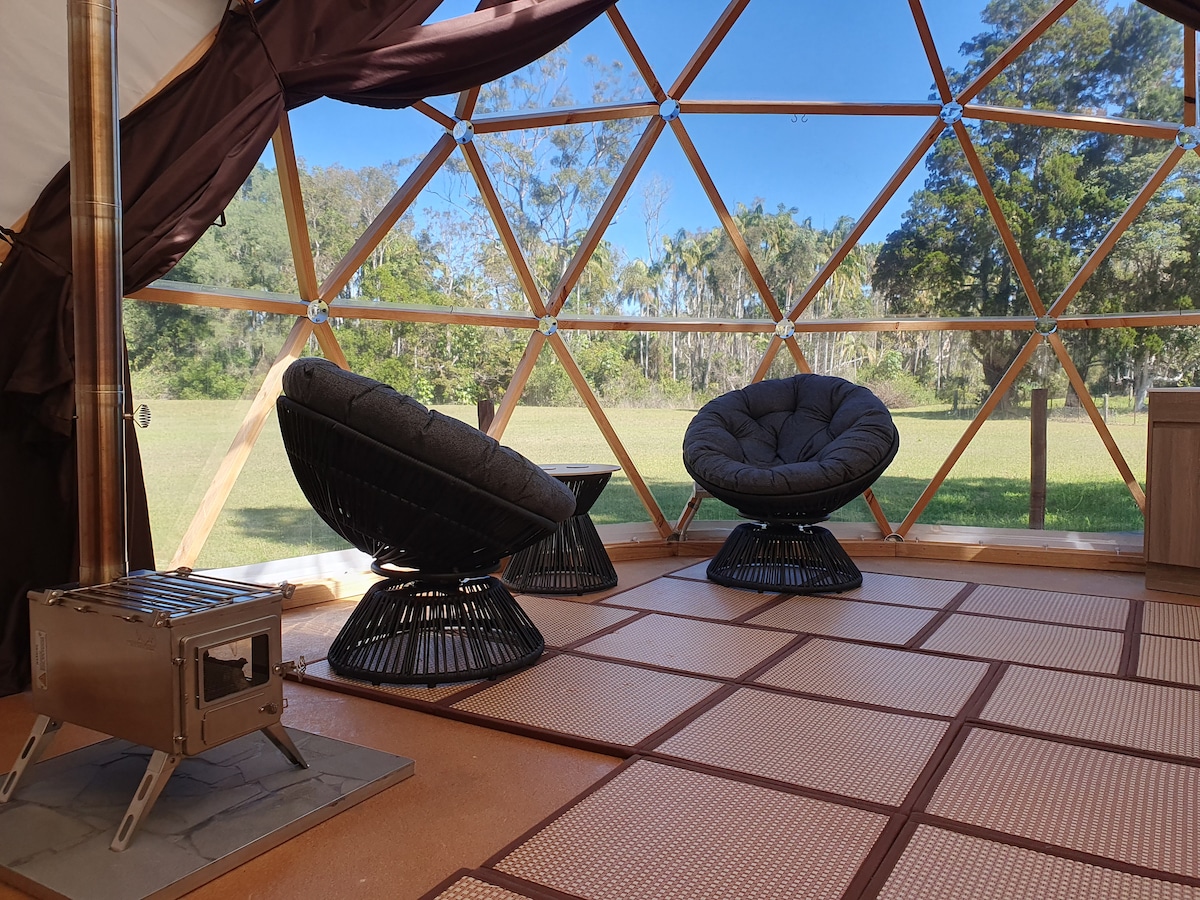 A jewel in the rain forest by the beach to wind down and relax! Fully self contained geodesic dome. Complete with outdoor bath and shower situated in rain forest just out of Iluka. Minutes from multiple pristine beaches. A private space with insect screened outdoor recreation area complete with kitchenette; small gas oven, cook top, fridge, sink and bench space. Your private bathroom 10 meters from the dome. Cosy fireplace, lovely views from the bay window and a skylight in the ceiling.