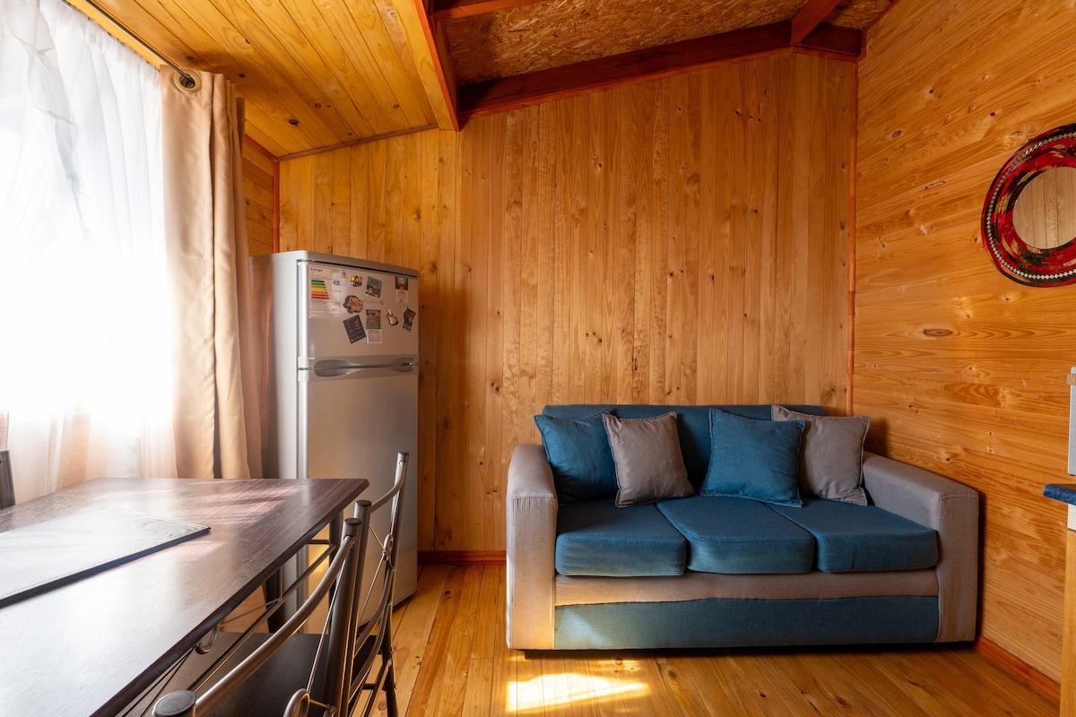 Cabană la 500 de metri de Villa Cerro Castillo, la poalele Parcului Național și la câțiva pași de traseul de drumeții până la Laguna, Rio Ibañez, trasee de alpinism, trasee de ciclism și călărie. 1 dormitor la primul etaj și altul la etajul al doilea, 1 baie, living cu bucătărie mică integrată. Poate găzdui 2 persoane (max 4). Priveliști uluitoare ale Cerro Castillo, cu o graniță de-a lungul Estero del Bosque. Ideal pentru 2 persoane care își doresc să se bucure de natură și activități în aer liber.
