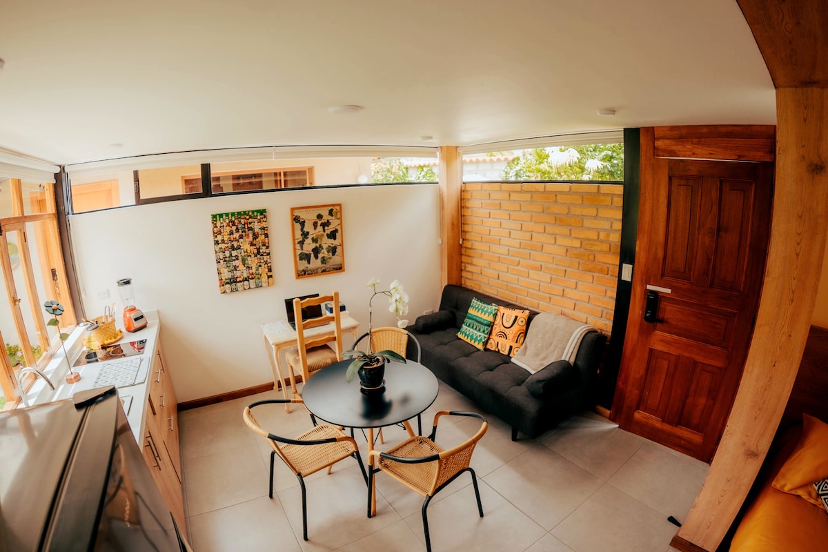 Relaxează-te în acest spațiu liniștit și elegant. Un mini apartament confortabil în sudul orașului, la doar 12 minute de centrul istoric, la 4 străzi de tramvai, la o stradă de c.c. Coralcentro. Are: Intrare privată Parqueadero Pat dublu Baie privată Bucătărie Veselă Chiuvetă Bar pentru micul dejun Frigider Blender Pulover Fier de călcat și fier de călcat Dulap Dotări pentru baie Prosoape