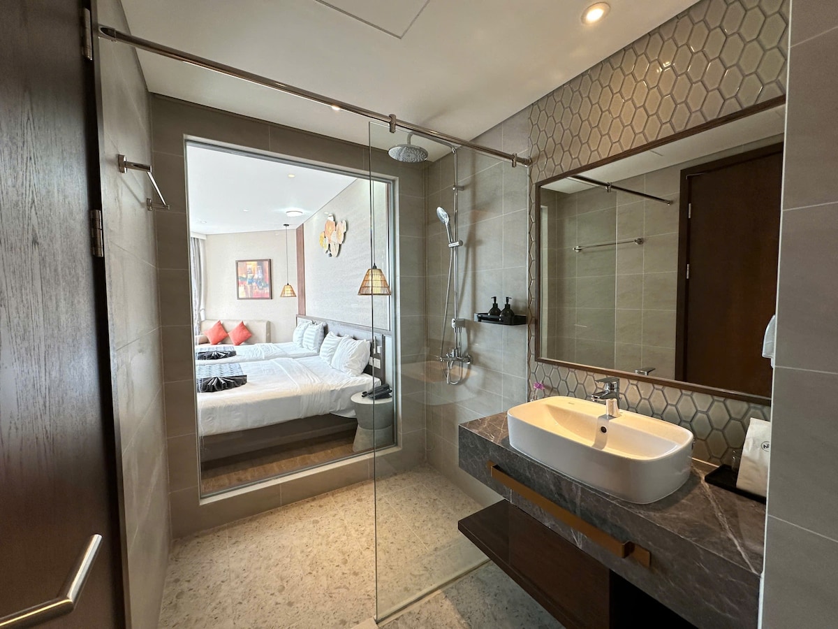 Apartament studio de 32m2 cu mobilier de lux cu facilități complete, inclusiv: * 1 pat mare 1m8 lenjerie de pat completă și lenjerie de pat. * 1 toaletă și baie modernă sunt dotate cu suficiente prosoape, șampon, gel de duș, uscător de păr... * 1 raft de chicinetă dotat cu cuptor cu microunde, boiler, mini-frigider ( fără suport de gătit în apartament, poate reîncălzi numai mâncarea) * Dulap suspendat, birou, televizor, Wi-Fi Fereastra mare, priveliștea înaltă a mării este foarte frumoasă