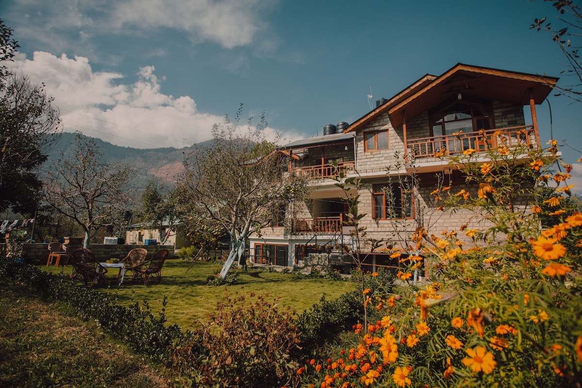 A true-blue working Apple orchard, barely 400 meters from the iconic & world-famous NAGGAR CASTLE, in a quaint little village called Chanalti. It is a rustic village set-up but fitted with all modern-day comforts - along with unending cups of herbal tea, coffee & stories to share! It is a place where the air is always fresh, the views are always stunning, and our hospitality is always homely, warm and welcoming! Min 2 Night Stay required! Pls. DO NOT book for 1 Night. STAGS NOT ALLOWED 🚫