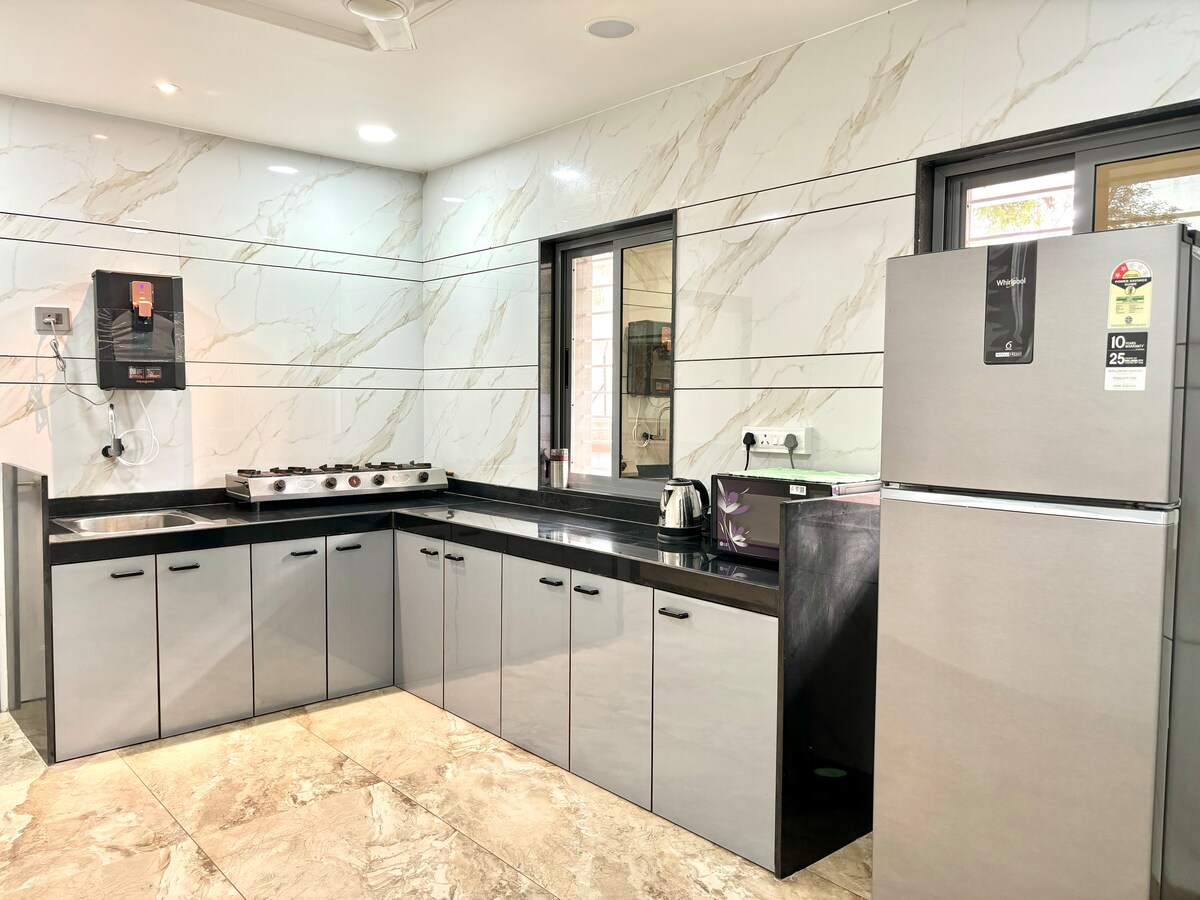 Apartament modern mobilat la ultimul etaj, cu 1 dormitor și bucătărie, în Balajinagar, Sangli, lângă Kupwad și Miraj MIDC. Living luminos cu fereastră mare din sticlă și vedere deschisă, Smart TV de 55”, WiFi de mare viteză și canapea extensibilă. Bucătărie modulară complet utilată, mașină de spălat rufe, dormitor cu birou, apă caldă și parcare. Ideal pentru șederi corporative, cupluri și familii mici. Check-in independent disponibil.