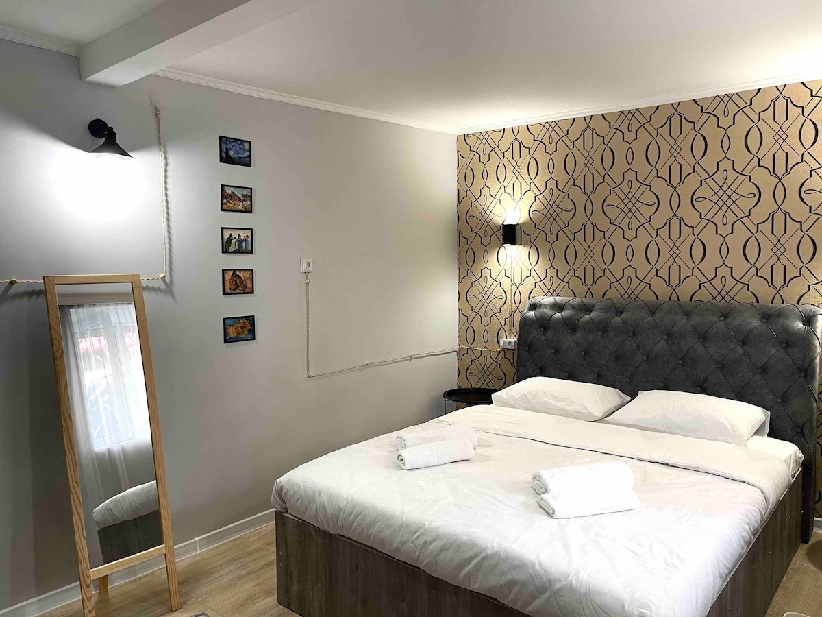 Apartament nou într-o clădire cu două etaje, izolat și cu intrare separată, situat în centrul istoric al orașului. Cazarea recent renovată este disponibilă pentru oaspeți. Principalele atracții, restaurante, cafenele și magazine ale orașului se află la câțiva pași. Proprietarii de locuințe vorbesc engleza, rusa și georgiana.
