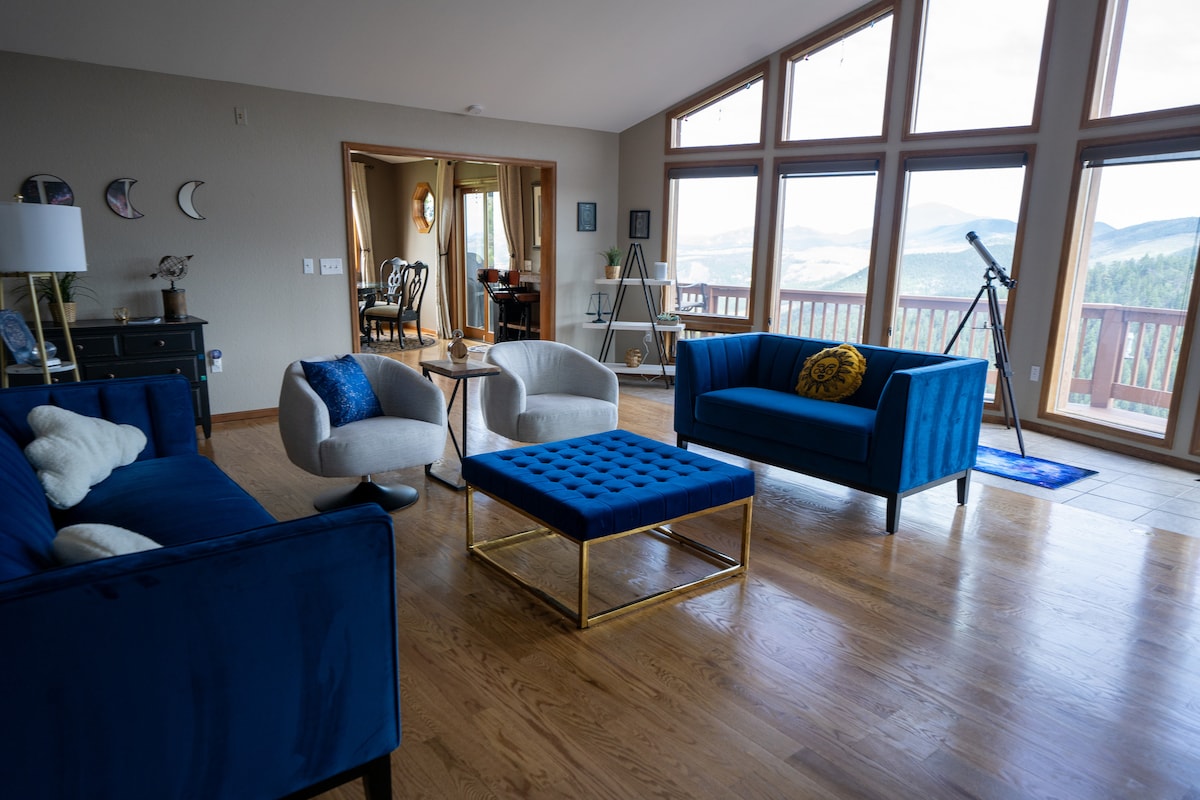 Recharge at the Hygge Chalet on 3.5 wooded acres with incredible views of the Rocky Mountains. The eco-friendly A-frame is inspired by hygge, a Danish sense of coziness & simple pleasures. An outdoor Finnish sauna, Norwegian fireplace, hammocks, EV charger, large wraparound deck, warm beverage bar, and luxury beds create a perfect cozy vibe. Explore a private hiking trail that goes from our property for miles into National Forest. Relax, refocus, & reconnect in this uniquely curated experience.