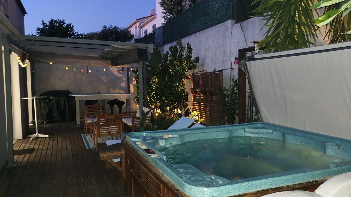 Descoperă acest loc atipic pentru a petrece momente de neuitat! Bucură-te de spa-ul cald în timpul iernii, precum și de vara răcoritoare Deschis 7/7 , 24/7 Complet privat , la vedere, cuibărit într-o grădină „interioară”. Vei fi uimit! Această casă cu aer condiționat este la doar câțiva metri de magazine alimentare, brutărie, restaurant mic, la câteva minute de mare cu mașina!