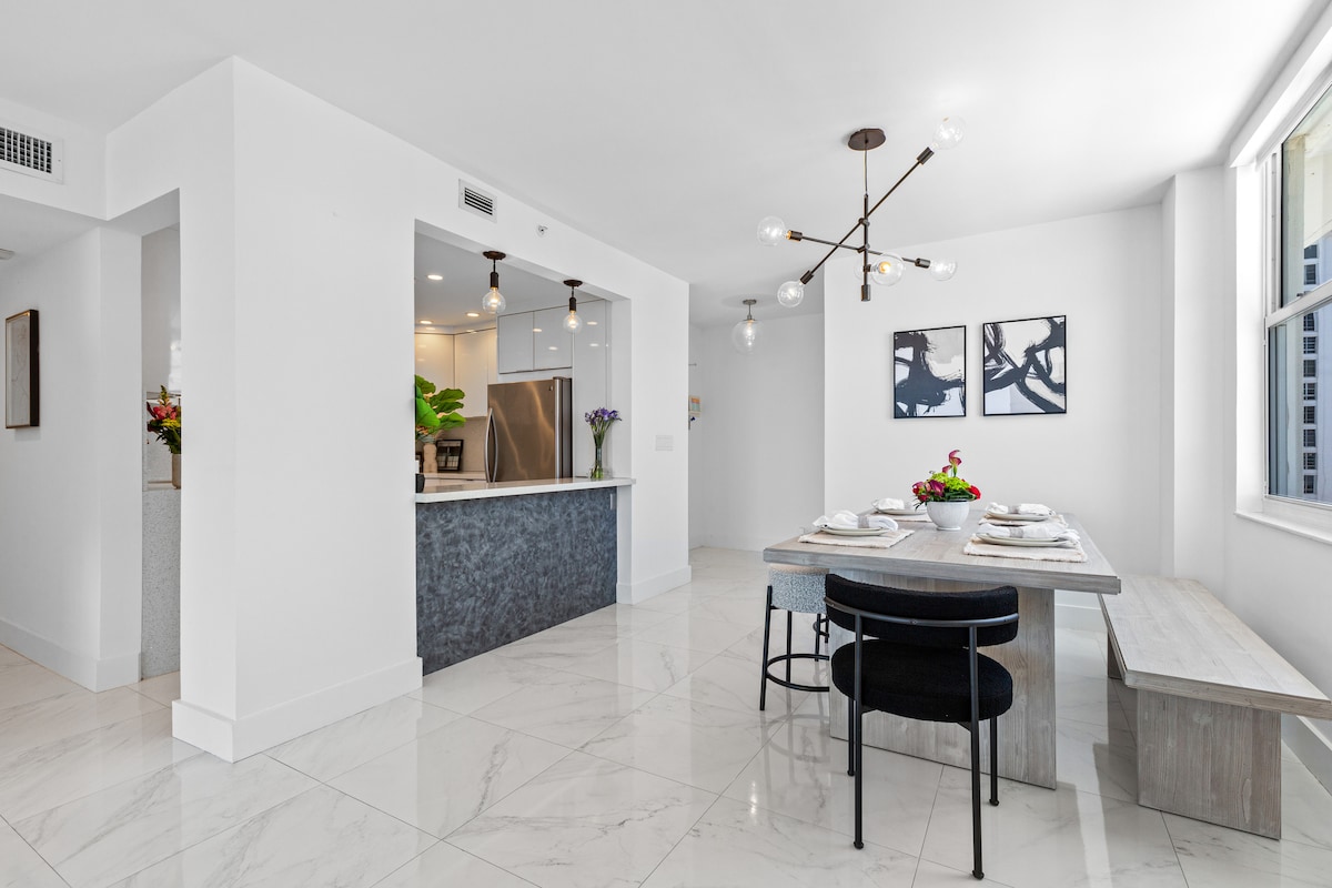 Experimentează confortul din Miami în apartamentul nostru luminos din Insulele Bay Harbor, cu ferestre din podea până în tavan, un aspect spațios deschis și un balcon privat înconjurat de verdeață luxuriantă. Acest refugiu cu 2 dormitoare și 2 băi oferă stil modern, confort de calitate hotelieră și draperii opace pentru nopți odihnitoare. Perfect pentru familii sau cupluri, bucură-te de acces rapid la plaje, magazine Bal Harbour, restaurante rafinate și atracții de top din Miami. Petrecerile nu sunt permise.