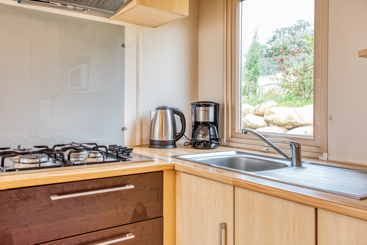 Această locuință de familie este aproape de toate obiectivele turistice și dotările. Casă mobilă de 33 m² cu terasă cu fronton, ideală pentru 4 persoane, compusă din patru camere: sufragerie cu bucătărie utilată, sală de duș și două dormitoare alături. (Un dormitor matrimonial cu pat dublu și un al doilea cu două paturi de o persoană) Afară, o terasă acoperită din lemn și mobilier de grădină.