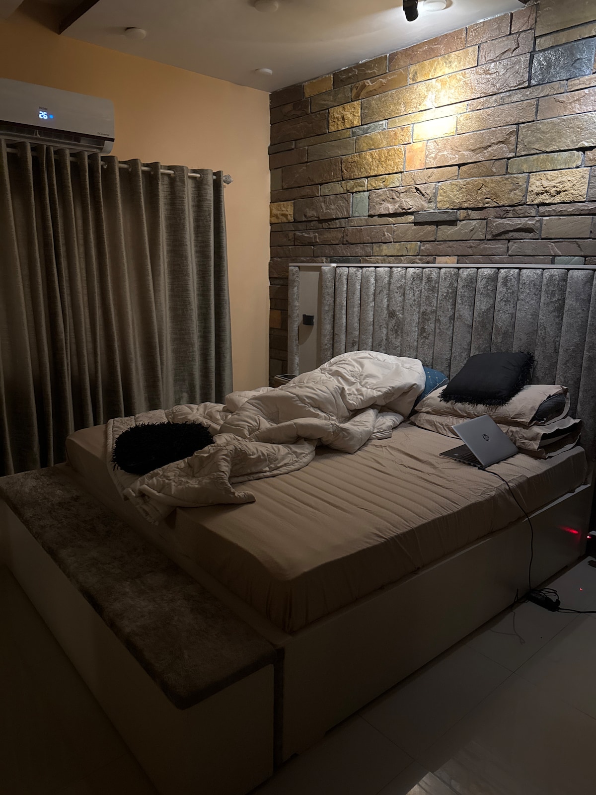 Airbnb modern cu 2 etaje, 3 paturi, 3 băi. Parter: dormitor matrimonial cu pat king-size, baie atașată, aer condiționat, fotoliu de masaj, salon spațios, zonă de luat masa și bucătărie cu frigider, dozator de apă. Etajul 1: 1 dormitor matrimonial cu aer condiționat, 1 dormitor single, ambele cu băi atașate. Wi-Fi de mare viteză, curat și sigur. Perfect pentru familii sau călători singuri care caută confort și comoditate. Regulă OBLIGATORIE în orașul Bahria Karachi: CNIC/Pașaport necesar pentru toți oaspeții.