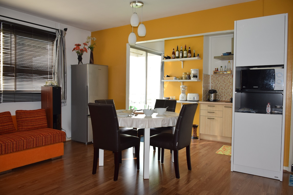 Furnished roomy studio apartment with kitchen and beautiful bathroom. Located in a relaxed, creative and trendy neighborhood. Public transportation within walking distance. Free Wi-Fi, washing machine, cable TV, bottled water and cleaning.
