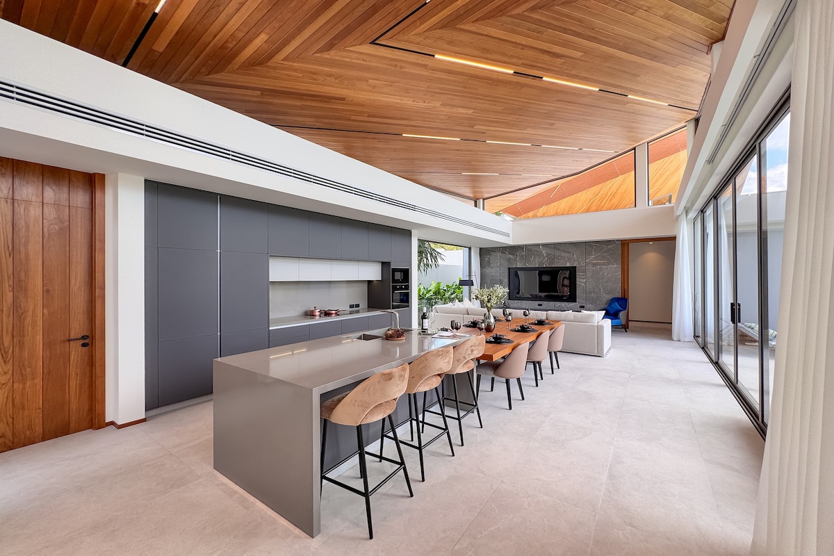 Experimentează luxul la noua noastră vilă de designer din prestigiosul Bang Tao — la doar 2 km de nisipurile moi și de marea cristalină Andaman. Bucură-te de 3 dormitoare elegante, un living luminos cu un televizor cinematografic de 100", o bucătărie gourmet și o piscină cu apă sărată de 4×9 m, blândă cu pielea. Găzduiește grătare la apus de soare în grădina tropicală luxuriantă, apoi relaxează-te sub un baldachin de stele. Parcarea privată, energia solară de 10 kW și securitatea non-stop asigură confort, intimitate și o viață de neuitat pe insulă.