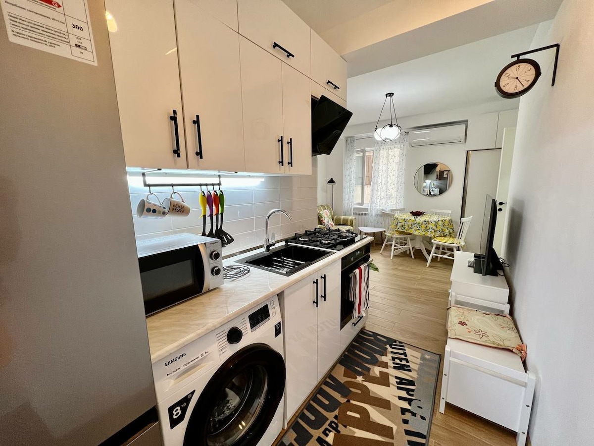 Acest spațiu unic este situat chiar în inima orașului vechi Kutaisi, la doar câțiva pași de centrul orașului. Designul său modern și lista bogată de dotări îți vor satisface toate nevoile: 2 paturi matrimoniale confortabile, prosoape curate și lenjerie de pat, o canapea confortabilă cu perne, o bucătărie complet utilată pentru self-catering, un televizor inteligent, Wi-Fi de mare viteză, aer condiționat, o mașină de spălat și cafea și ceai gratuite. Așa că relaxează-te, relaxează-te și simte-te ca acasă🏠 🚭 Fumatul interzis în interior Animalele de companie🐾 nu sunt permise
