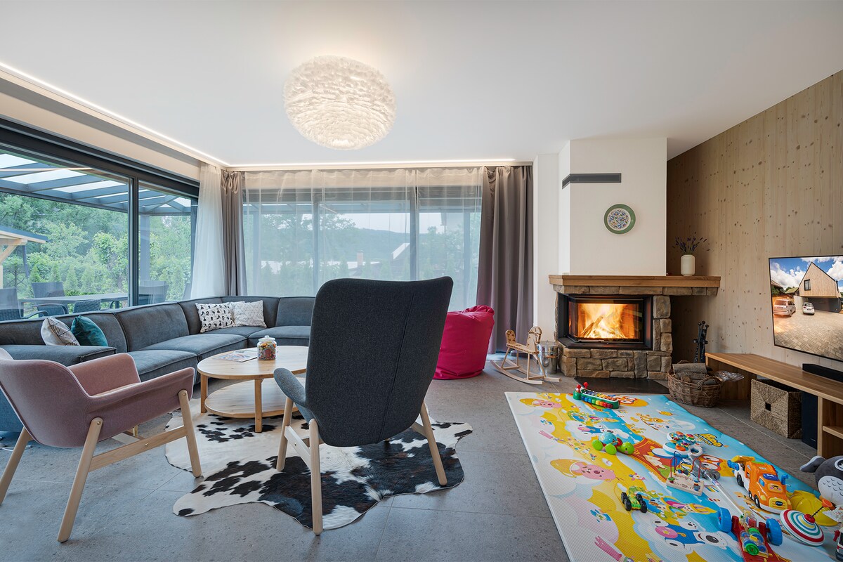 This unique vila with a hot tub was designed to accommodate families with children Parents can see their children in the yard from the comfort of the living room or terrace. A stream flows right behind the fence and it is possible to walk along the stream to the village center, which is a 7-minute walk away, or to the forest and the reservoir, about 15 minutes. walk away. The cottage is an ideal base for exploring the breathtaking nature of Slovakia with nearby ski resorts and hiking trails.