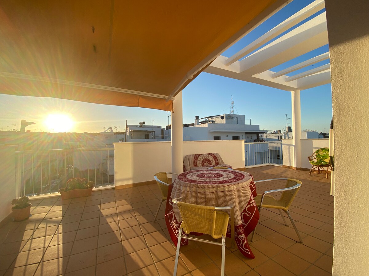 Penthouse în centrul orașului Barbate, cu o terasă dotată cu hamace, grătar, canapea, masă și scaune. Wi-Fi, aer condiționat și o canapea extensibilă pentru 2 oaspeți suplimentari. Ideal pentru cupluri sau familii mici, la doar câteva minute de plajă.