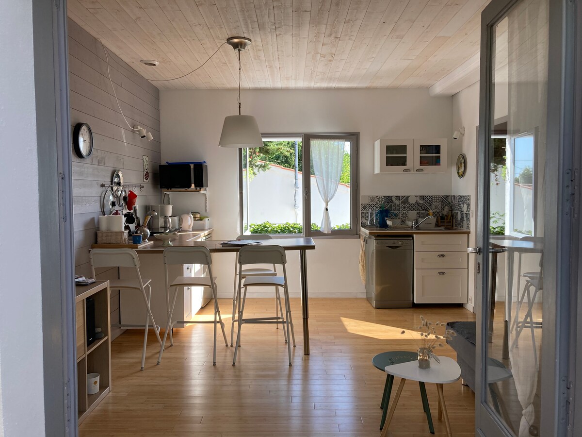 Bine ai venit în locuința lui Julie! O escapadă revigorantă la malul mării, accesibilă cu trenul (la 1 oră de Nantes) și fără a fi nevoie de mașină la fața locului, pentru o relaxare și mai bună… Îți urăm bun-venit la parterul unei reședințe fermecătoare din secolul al XVII-lea, situată la 10 minute de mers pe jos de absolut tot: ocean, piețe, magazine, restaurante și cafenele cu terasă... Pietre, lemn, materiale naturale și culori alese cu grijă te vor înconjura, creând un decor confortabil și primitor.