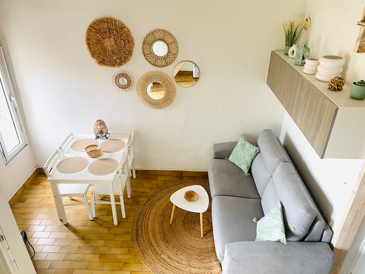 Apartament confortabil la 500 m de malul mării. Ideal situat, la 6 minute de mers pe jos de plajă , la 3 minute de mers pe jos de supermarket, magazine, restaurante, farmacie, farmacie, piață, La Poste, Poliția Municipală. Zonă liniștită și relaxantă, reședință mică și plăcută. Etajul 4 fără lift. Acces securizat, parcare privată și păzită. Living/sufragerie cu TV, masă pentru 4 persoane, canapea extensibilă, mezanin cu pat dublu, sală de duș/toaletă, bucătărie utilată.