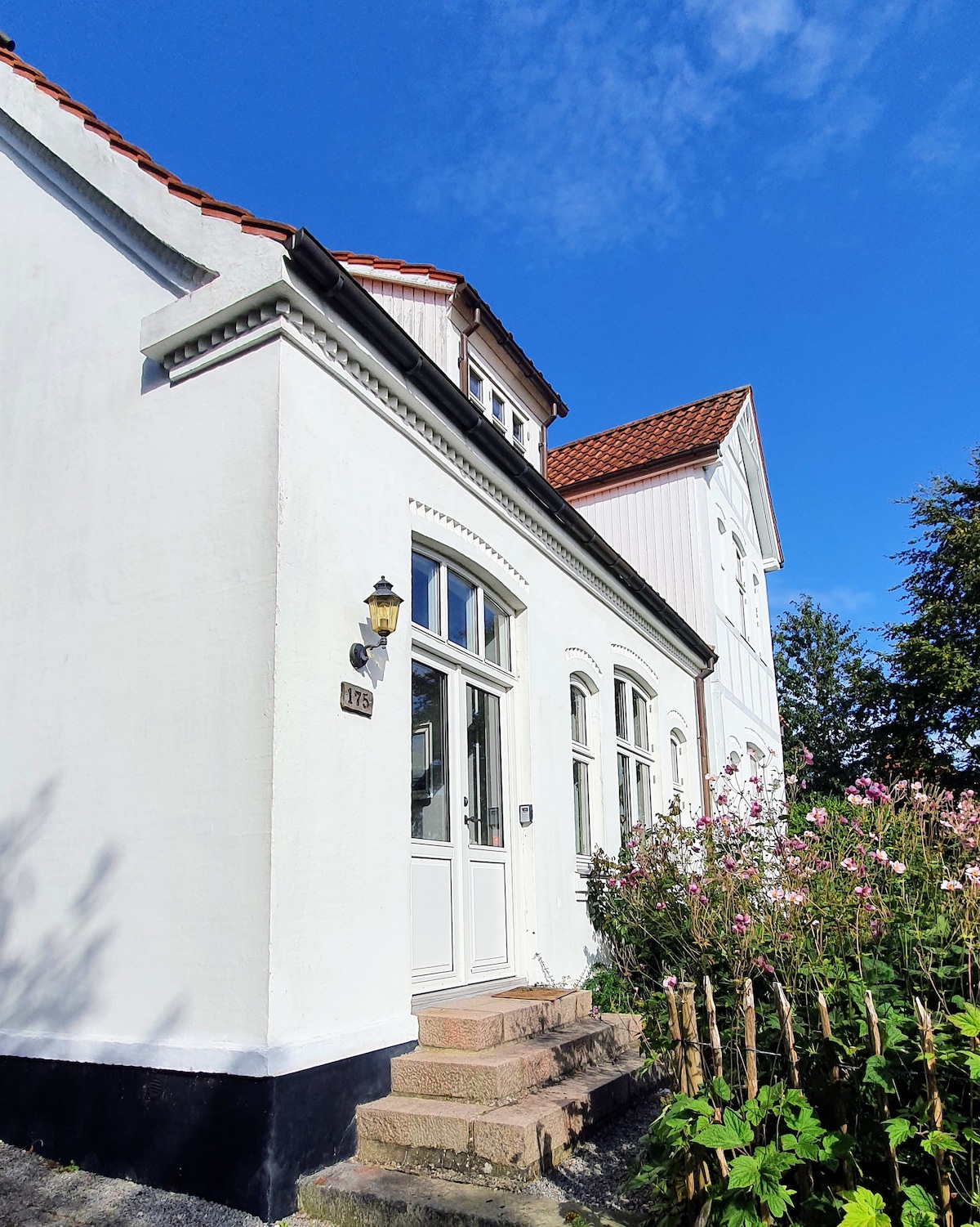 Her får i en bid af det chamerende "gamle" Juelsminde . Huset er bygget i 1929. I facade butikken driver jeg en lille hyggelig frisør salon, og i “husets” garage driver vores voksen datter en blomsterbutik 🌺,mens det ny istandsat baghus + førstesalen rummer den 74 m' store feriebolig. I den blomsterrige have er der to terrasser, så både morgenkaffen og aften grill kan nydes i solskin.