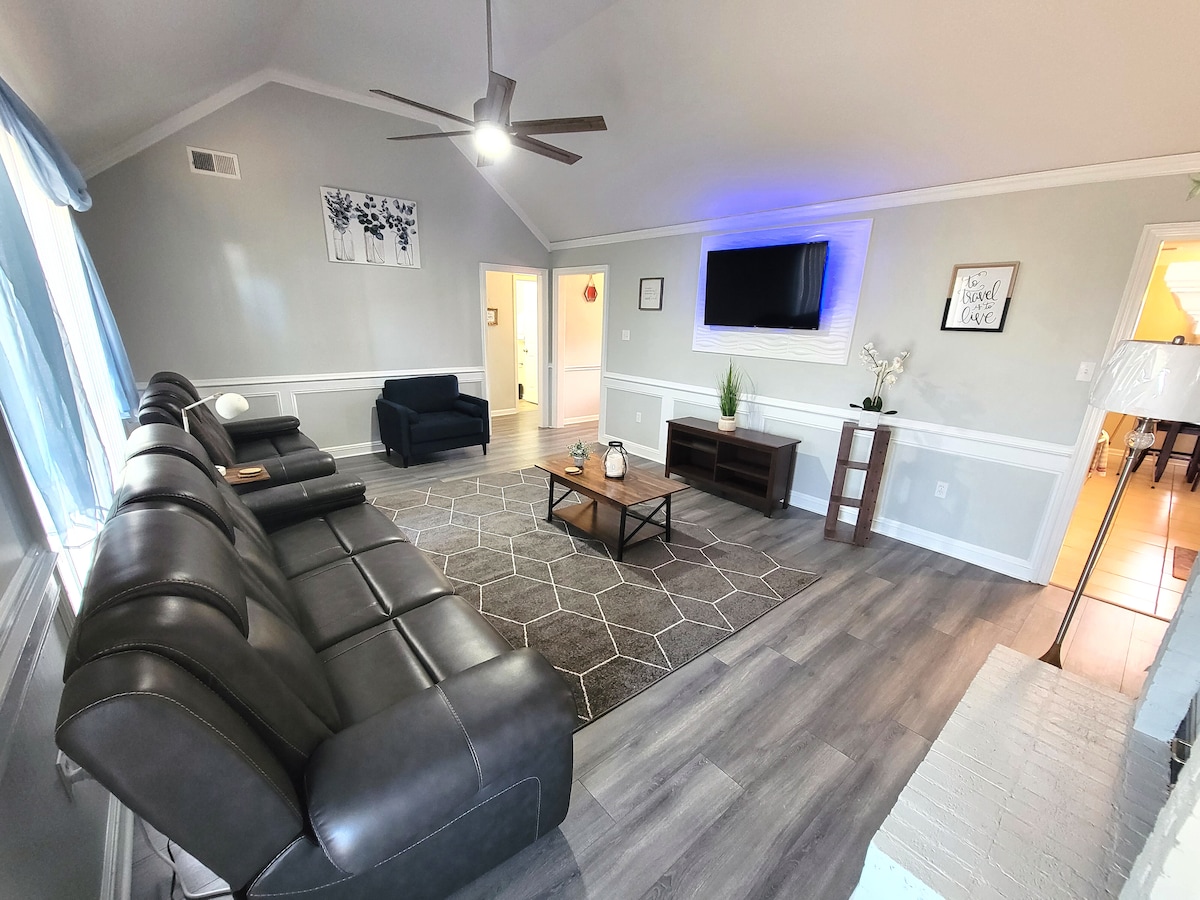 Relaxează-te în această cabană confortabilă, cu 3 dormitoare și 1 baie. Proaspăt mobilat și decorat, inclusiv 3 televizoare inteligente pentru a transmite conținutul tău personal, 2 puncte Echo și un șemineu vizual sigur pentru acea notă de ambianță. Bucătărie complet utilată, inclusiv aragaz și frigider mare. O cameră rustică suplimentară cu un pat de zi și un spațiu de lucru în cazul în care ai nevoie să iei legătura cu biroul. Zonă imensă în aer liber pentru acest joc improvizat. Scaune în aer liber și groapă de foc cu gaz pentru a te bucura de acele nopți din Memphis.
