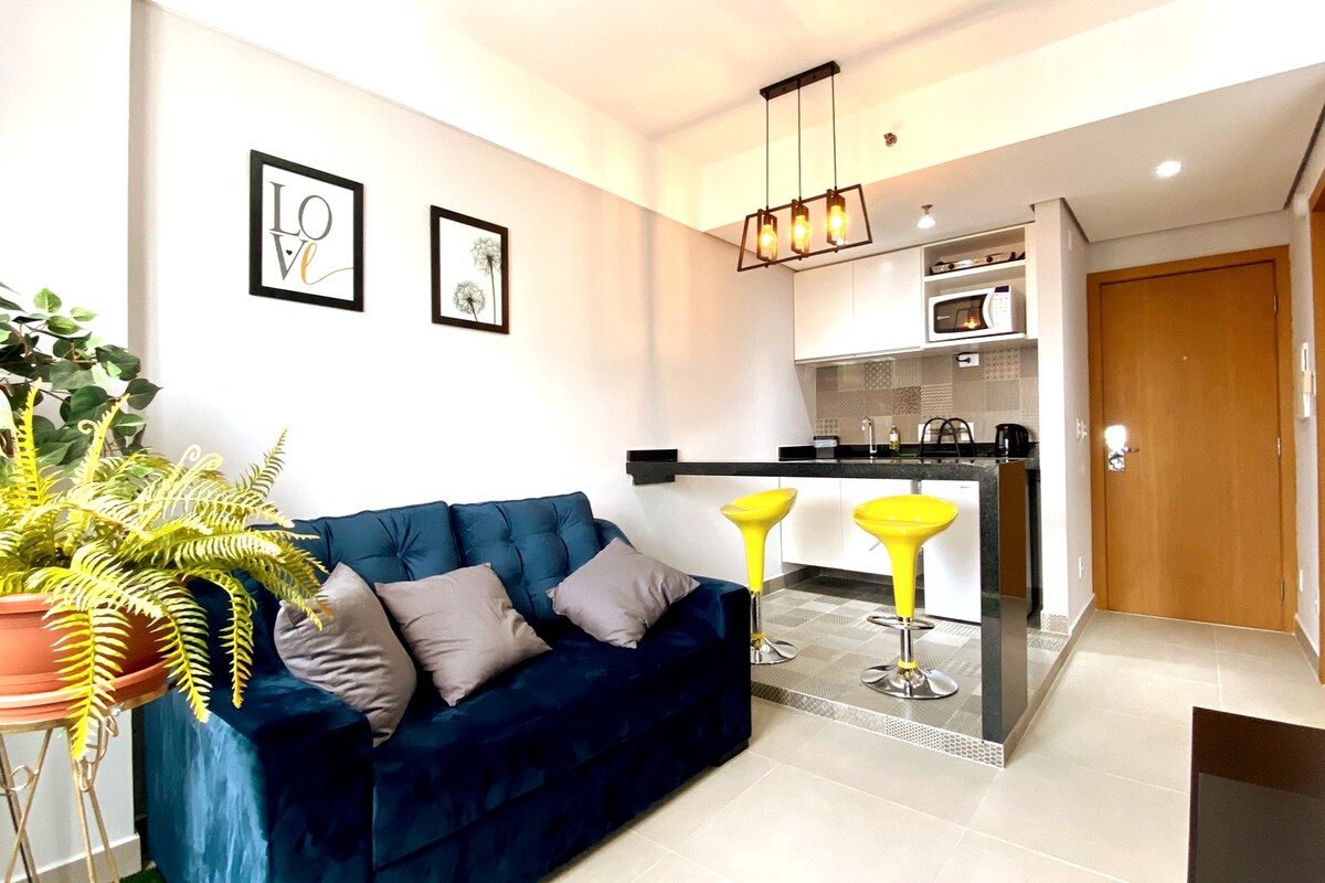 Tenha uma experiência elegante e aconchegante neste apartamento muito bem localizado, equipado e com serviço diário de camareira. A vista panorâmica do terraço, no último andar do prédio, onde ficam a piscina e a jacuzzi é um espetáculo à parte. Perto das principais empresas da região e de todas comodidades que um bairro completo oferece. Academia, sauna e brinquedoteca e uma vaga de garagem complementam a estadia. WiFi fibra de alta velocidade próprio na unidade.