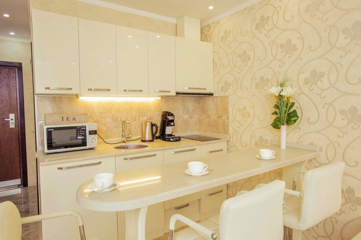 Apartment that is opposite the water park, in the first coastline, from the sea 2 minutes walk, across the road beach. It is decorated in a modern style with exquisite taste! The apartment is located in close proximity to the New Boulevard, shops, pharmacy, to the singing fountains for 5 minutes to walk, in the same line are cafes-bars, restaurants, there is everything necessary (dishes, appliances, washing machine, bedclothes! The place is suitable for couples, business travelers and families.