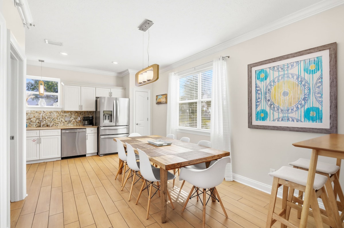 You’ll love this upscale beach retreat for its gorgeous decor, heated pool, outdoor shower, private backyard, and 800MB+ internet speeds! Inside you'll find a beautiful kitchen and sleeping arrangements for nine. We're a quick walk to the beach, and a 10 minute drive to 30A or to Pier Park! Pool heating is available for $40/day. Details below. Our 6 seat golf cart is available for rent for $125/day We are dog-friendly with payment of a $170 pet fee. Three dogs maximum.