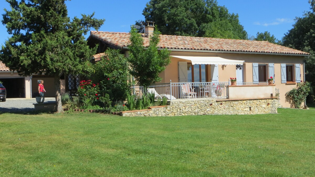Cabană din lemn de 36m2 cu 2 zone de luat masa în aer liber: o terasă pe picioroange de 20m2 și un spațiu cu grătar sub copaci. Zonă mare în aer liber împădurită cu stejari cu vedere la Pirinei. Cu mașina la 45 de minute de Toulouse și la 5 minute de autostrada A64. Perfect pentru o ședere relaxantă sau o ședere în natură (drumeții: ciclism montan și drum, drumeții). Cabana este compusă din: * Plită cu lemne * Bucătărie mobilată * Persoane 4 (2 140 de paturi) * dacă persoana SUP canapea * Toaletă separată *Baie * Parcare privată