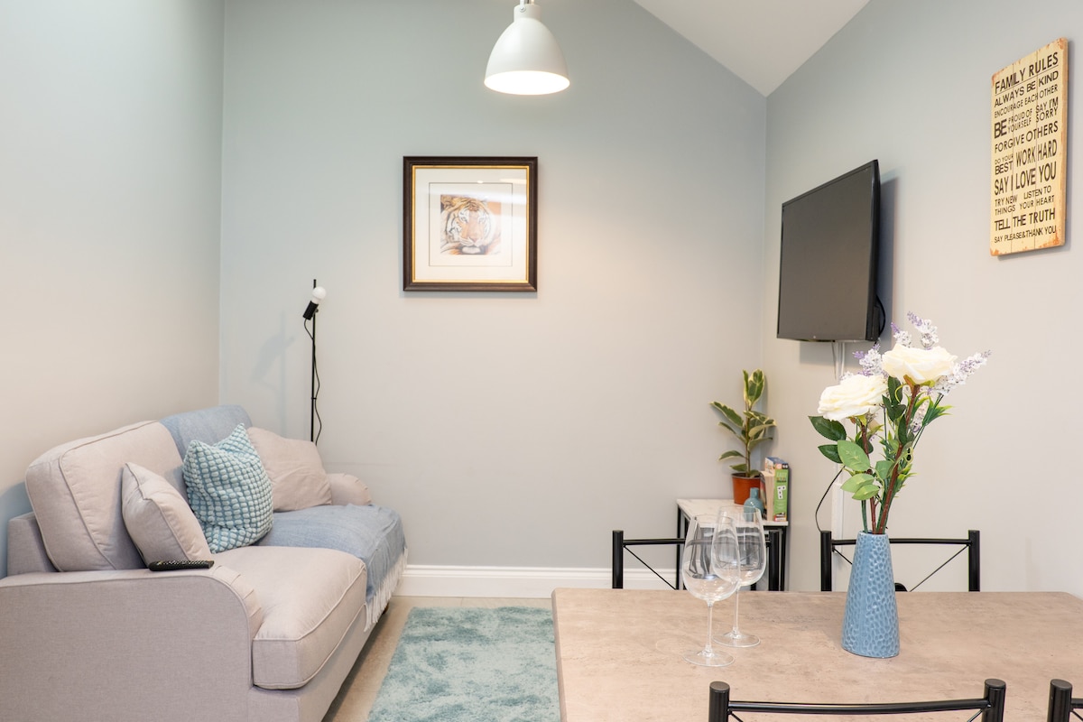 Newly refurbished self contained flat in a village location. Light and airy well lit and heated comfy space . Separate shower room and toilet (all toiletries provided) no shaving plug. Kitchen includes a full electric cooker and 4 ring hob,undercounter fridge,sink and all other essential cooking appliances. Dining table and chairs and a 2 seater settee. Welcome pack included.