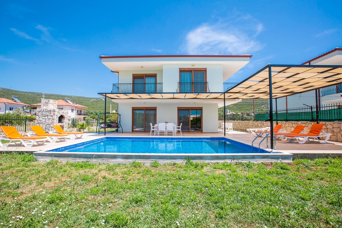 Această vilă, care este situată într-o locație liniștită, înconjurată de natură, cu arhitectura sa modernă, are o capacitate de 5 persoane și are un jacuzzi , piscină și grădină mare. Distanța până în centrul orașului Kaș și până la mare este de numai 10 minute cu mașina. Acesta își deschide porțile pentru oaspeții noștri pentru o vacanță de neuitat.