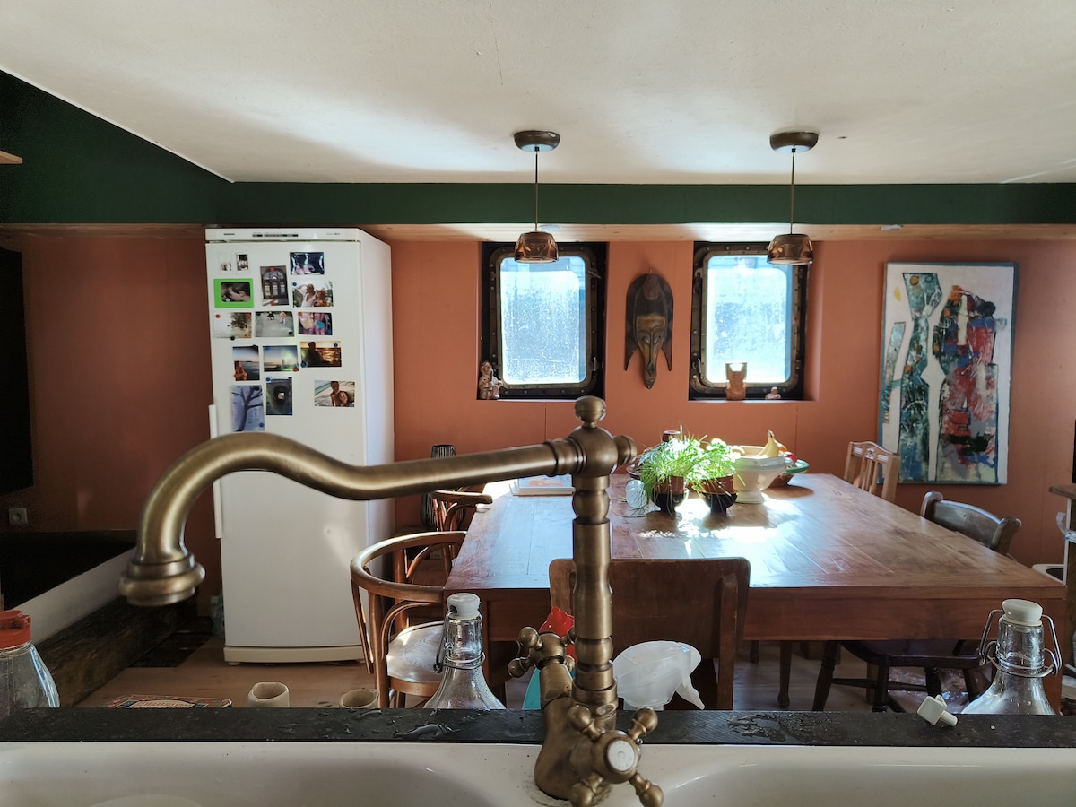 Situat în partea din spate a bărcii centenare ALOHA , ancorată în portul iahturilor din Liège . Această locuință se află în cabana istorică, unde au trăit barcagii timpului. Acesta a fost complet renovat pentru a satisface standardele actuale, restaurând în același timp toată mobila de epocă. Veți fi 2 persoane în cel mai mare confort și 4 dacă utilizați ca un cuplu paturile mici de 1m20 lățime ca în acel moment . Oricum va fi un sejur neobișnuit și de neuitat.