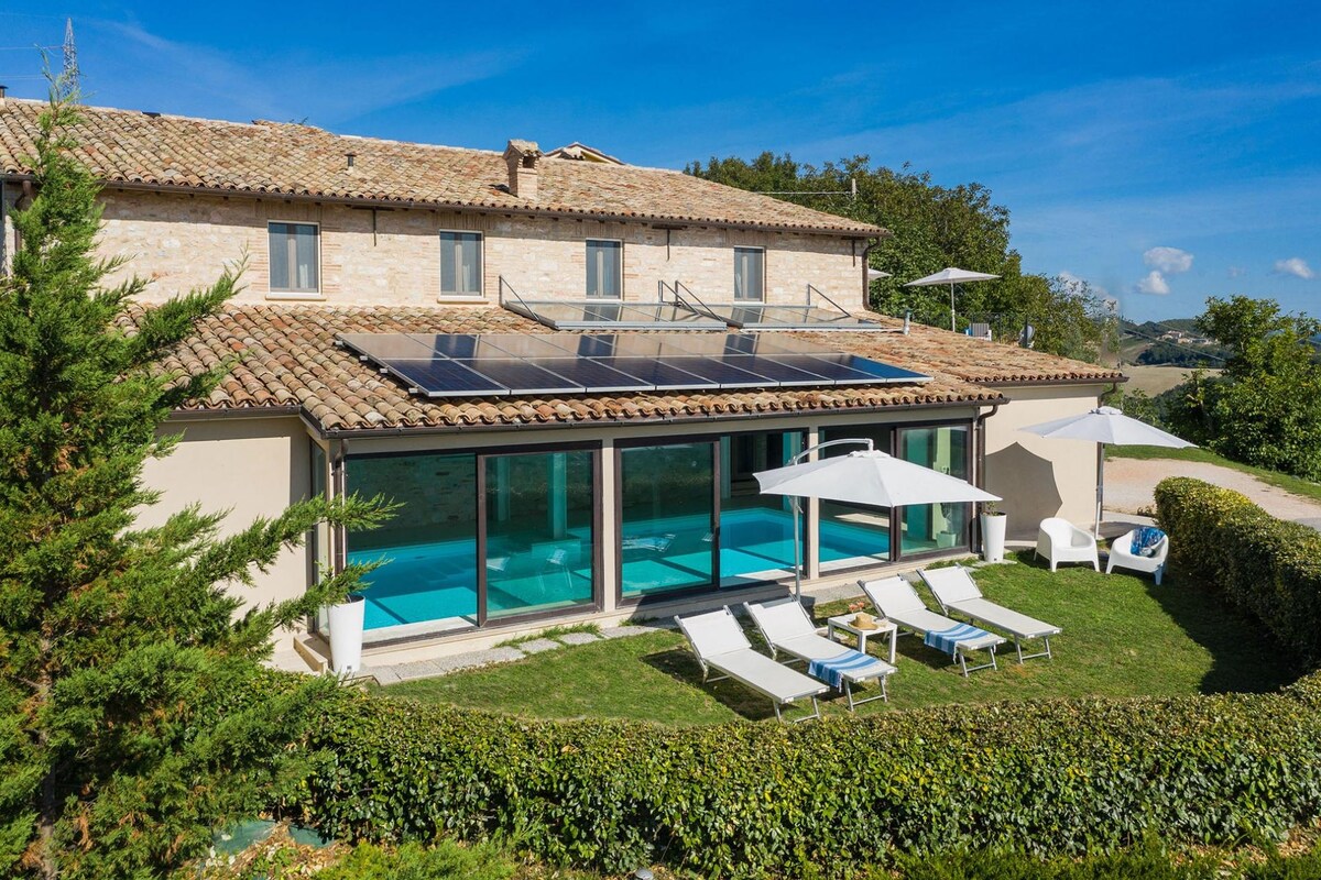 Villa Sabrina is a refined private villa with swimming pool in Le Marche region and offers every comfort for a regenerating holiday in nature. It is located a few km from the town center of Cagli, in a quiet countryside area with panoramic views. The modern design of furniture, the salt water heated indoor pool and the magnificent Jacuzzi create an intimate atmosphere. Guests can benefit of a porch equipped for al fresco dining and outdoor areas for relaxation. The property is completely fenced.