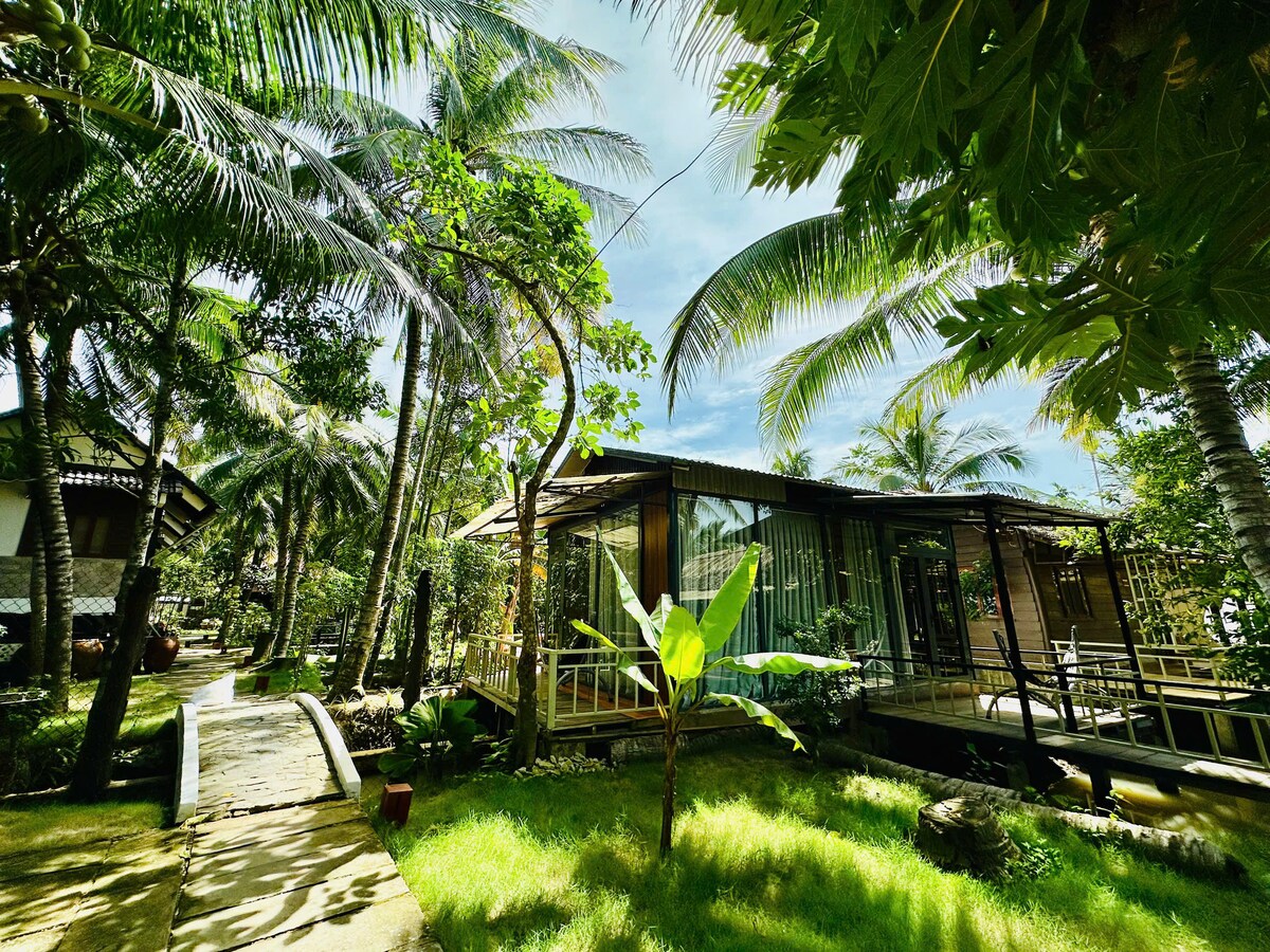 Nhà vườn nằm giữa không gian xanh mát của vườn dừa: - Khoảng sân trước nhà được trang trí bằng những dây đèn lấp lánh, tạo không khí ấm cúng và lãng mạn, có thể tổ chức tiệc nướng, sinh hoạt lửa trại. - Nhà có 2 phòng ngủ, 2 máy lạnh, bếp ăn, bàn ăn dài. - Quanh nhà là dòng kênh chảy men theo tường và những hàng dừa cao vút mang đậm nét đặc trưng của vùng sông nước Miền tây Nam bộ, Việt Nam. - Đặc biệt sau nhà có 1 căn còi được làm trên thân cây dừa, có thể ngắm toàn cảnh vùng quê từ trên cao.