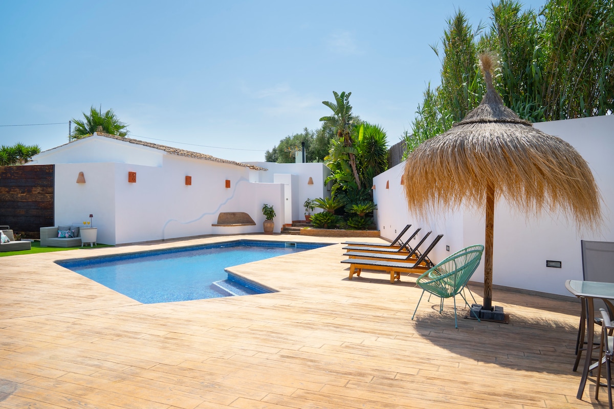 Vilă de 110 mp pentru 6 persoane, inclusiv 2 apartamente, piscină, terase, grădină, 2 locuri de parcare private. Vila noastră tipică spaniolă se află într-o fundătură, liniștită, la 3 minute de mers pe jos de golful de nisip „ Cala Advocat”, înconjurat de pini și palmieri. ( Casa și piscina au vedere la mare) Casa cu cele 2 apartamente este numai pentru tine! Nu există alți chiriași ” - Fără petreceri!