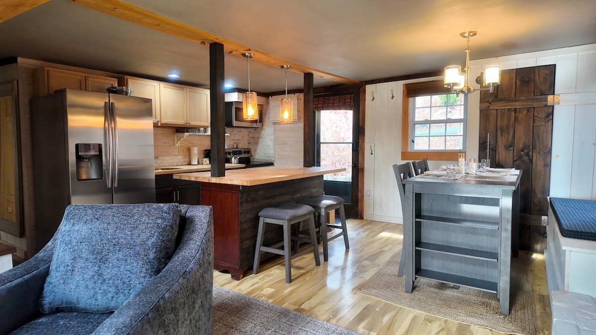 Relaxează-te în acest spațiu calm și elegant. O escapadă liniștită ascunsă în pădure, se află lângă un pârâu, astfel încât există întotdeauna sunete de apă și priviri pe timp de noapte. Proprietatea se află pe aproape 4 acri de pădure, ziduri frumoase de piatră și este la 20 de minute de mers cu mașina de schi, drumeții sau un lac, ceea ce o face perfectă indiferent de sezon! NOTĂ: există UN pas de la zona bucătăriei până la living și UNUL la duș. Intrare privată la o ascunzătoare confortabilă în pădure. Perfect pentru muncă la distanță!