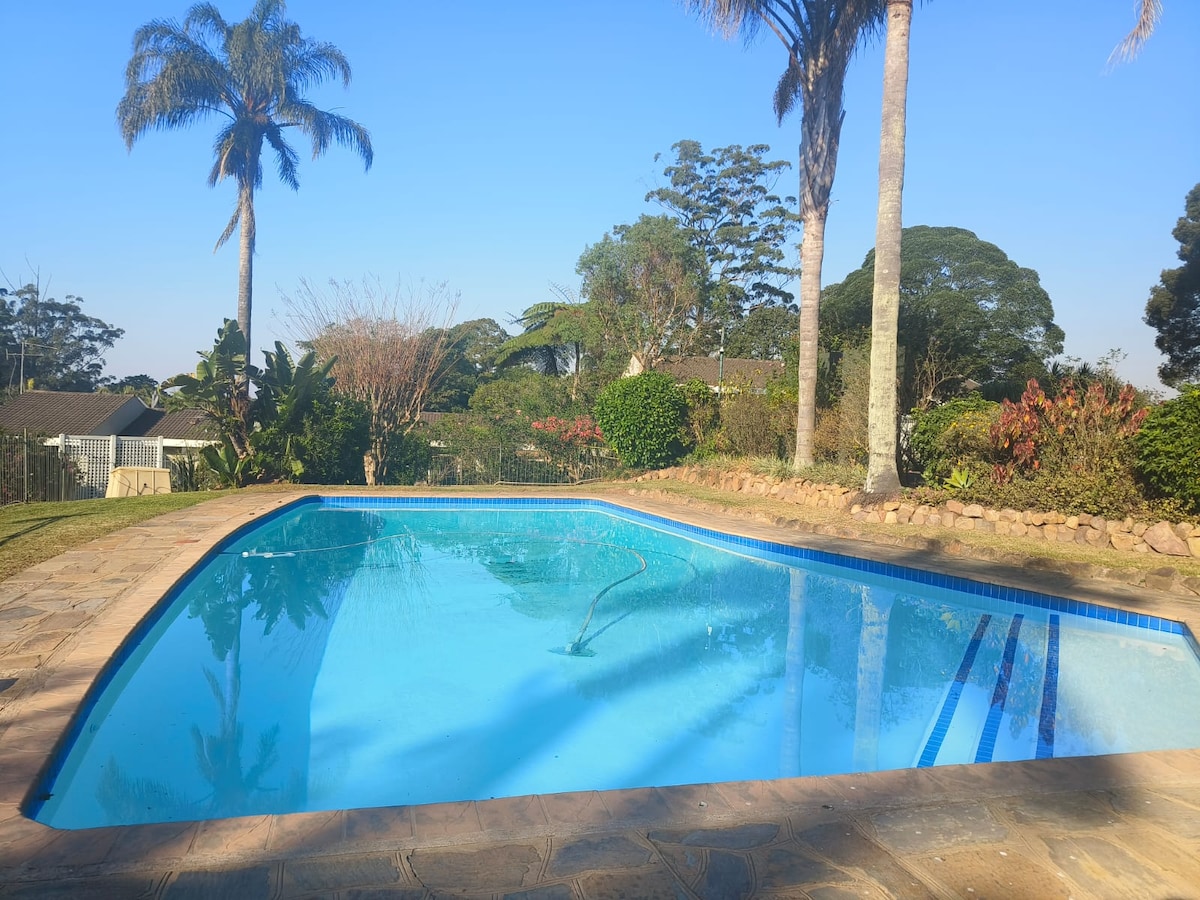 Frumosul nostru studio de self-catering este situat pe proprietatea noastră și este foarte privat, confortabil, cu priveliști uimitoare. Are DSTV complet, Wi-Fi, aer condiționat, parcare sub acoperire, piscină și o intrare privată. Aproape de mall-uri, restaurante, plaje și la 15 minute de mers cu mașina de Aeroportul Internațional King Shaka. Oferim ceai,cafea,lapte, iaurt și muesli. Bucătăria are, un mini-cuptor, cuptor cu microunde, ceainic, frigider, prăjitor de pâine. Putem găzdui un COPIL MIC Numai, NU al treilea ADULT pe un pat mic!