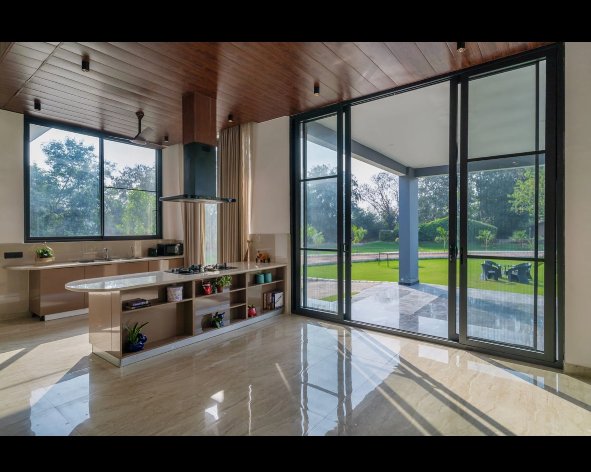 The sparkling pool, framed by open skies & swaying trees, sets the rhythm of this tranquil 5-BHK farmhouse, where every moment flows at its own unhurried pace. Spread across an acre of lush greenery, the villa balances elegance with ease. The private swimming pool is the crown jewel, shimmering under the sky—a tranquil oasis where time slows & the world fades away. Mornings begin with a quiet dip in its cool embrace, afternoons stretch lazily on sun-kissed loungers.