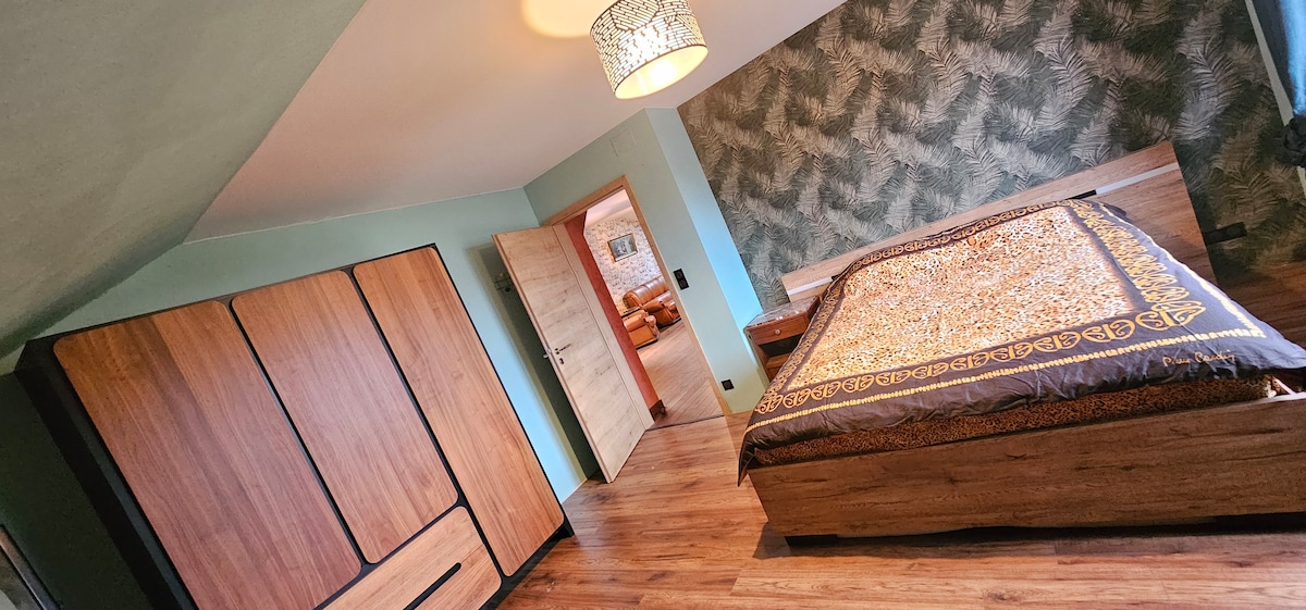 Locuim la țară, la 5 km de Haguenau, la 23 km de Strasbourg și aproape de Vosges du Nord . Casa noastră este din lemn; vei sta într-o parte din ea (2 camere în duplex - dormitor și spațiu de birou la etaj - living la parter) în partea din spate a cazării noastre. Confortabil, liniștit și luminos, acest loc este perfect pentru un cuplu. Intrarea e privată. Ferestrele locuinței au vedere la curtea din spate. Te poți bucura de teren.