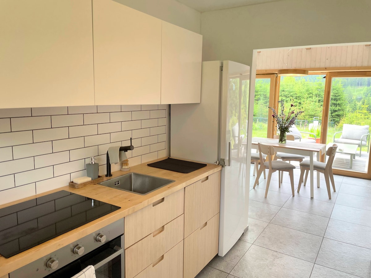 Experimentează tendința minimalistă cu confort maxim într-o locație perfectă în centrul orașului Liberec. Această cabană elegantă, complet echipată, cu 2 dormitoare, combină romantismul și liniștea naturii cu o vedere panoramică uimitoare la Ještěd, dar în același timp se află la doar câțiva pași de principalele atracții și de viața de noapte a orașului.