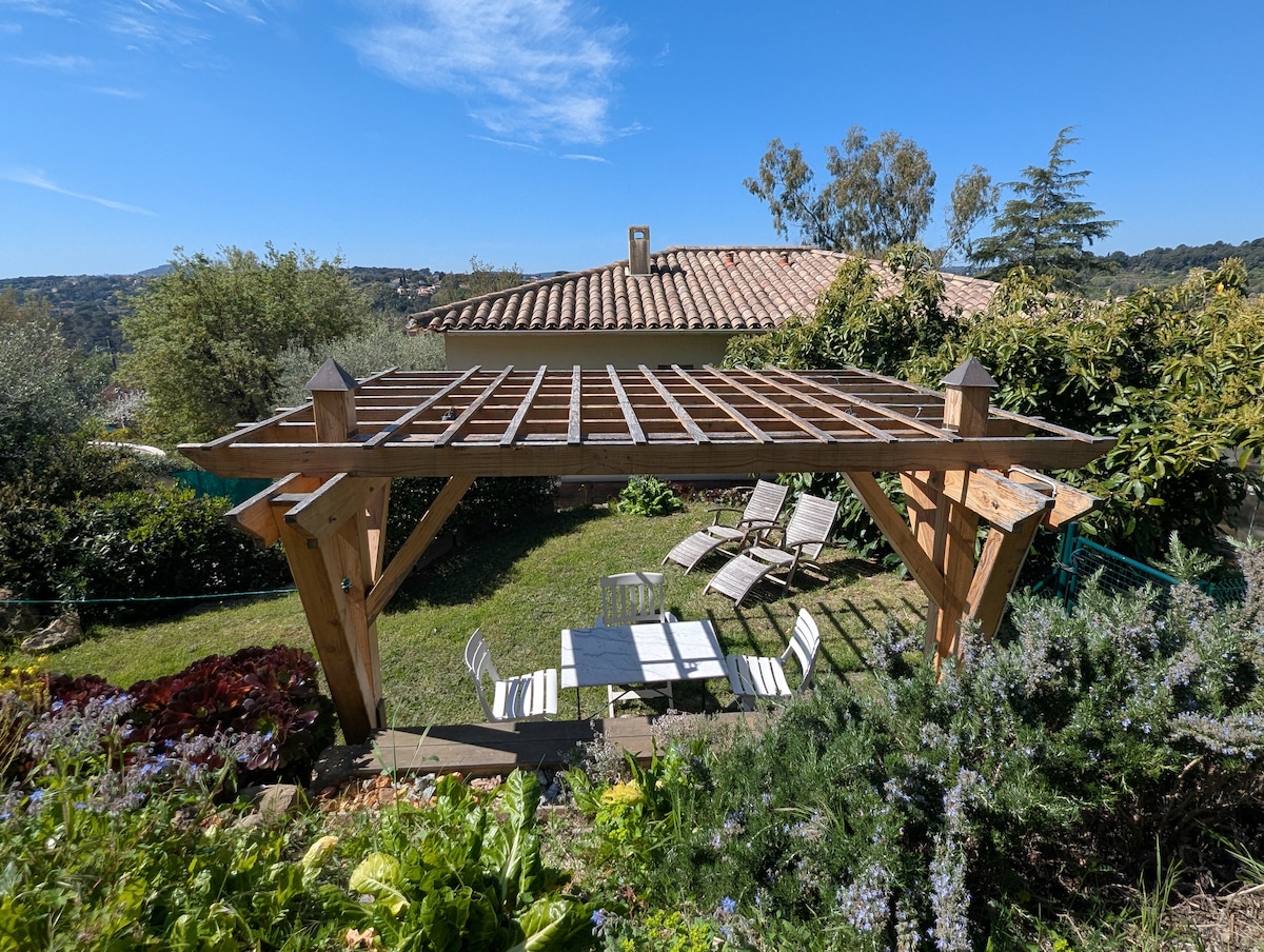 Bienvenue chez nous, à Biot, le magnifique village médiéval. Notre maison indépendante (plein pied +/- 60 m2) est idéalement située plein sud en face d’une zone verte, tout au-dessus d’une colline surplombant la belle région vallonnée de la Côte d'Azur offrant une vue splendide sur les montagnes environnantes et un aperçu mer. Nous sommes situés dans une rue calme, sans issue, mais tout de même proche des villes comme Antibes (8 min), Nice (15 min) et Cannes (20 min).