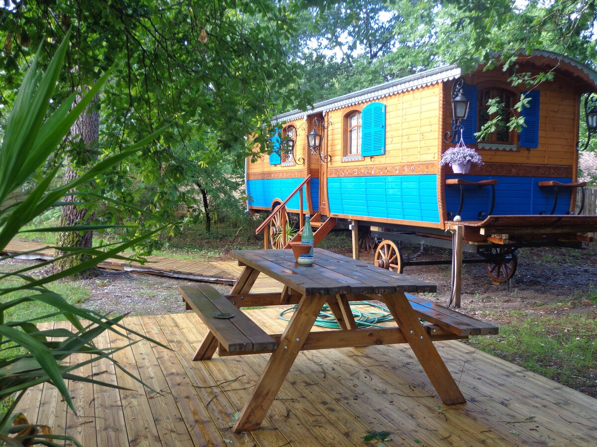 Rulotă de epocă spațioasă cufundată într-o grădină forestieră de permacultură de 3000m2: rustică, dar confortabilă! Natura, pacea, liniștea domnește aici. Este un schit, un loc de vindecare: din 1999, am investit multă grijă și dragoste în acest loc. Numai pasionații de natură și wellness vor aprecia acest lucru. Nu este o cameră de hotel sau un palat. Piste pentru biciclete în apropiere ( 3 minute ) Pădure alăturată. Lacul Mimizan, la 6 km Ocean: 7 km. Cu bicicleta: 25mn.